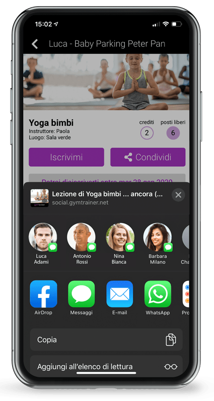 Con BookyWay sia i tuoi clienti che tu potrete condividere le informazioni di una delle tue tante attività via sms, whatsapp, facebook, e-mail, insomma attraverso lo strumento che preferisci per far conoscere velocemente a tanti potenziali clienti tutti i tuoi corsi.