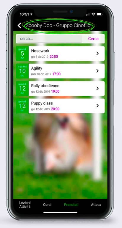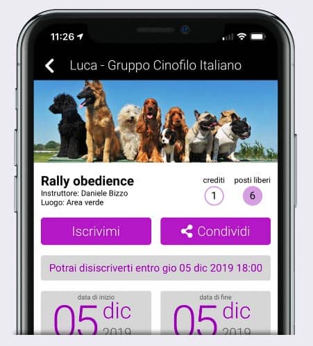 Permetti a tutti i tuoi clienti di vedere i tuoi corsi nella loro app per cinofili con descrizione e foto dell’attivitĂ e di prenotare o pagare attraverso gli acquisti in-app.